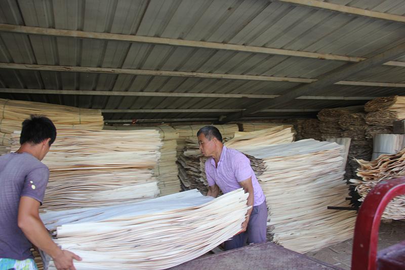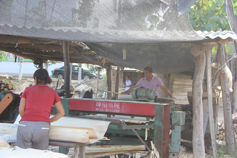 6月25日下午,在大营镇三户赵村赵合周的板材加工厂,伴随着机声隆隆,赵合周熟练地将一根根圆木放进剥板机,一块块1.27米长、0.64米宽的薄木板(俗称皮子)通过传送带陆续从机器尾部“吐”出,赵合周的妻子熟练地接过“皮子”,放在身边的三轮车上。