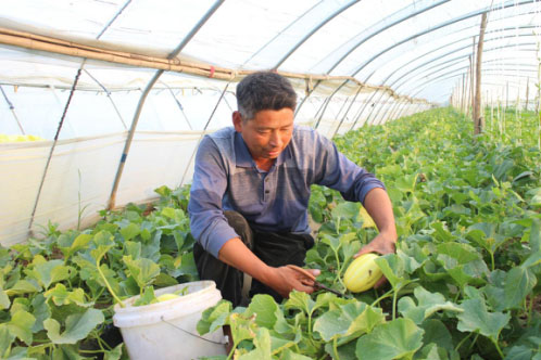 5月3日,庄头镇马头岗村村民赵新营正在大棚里忙着采摘香瓜。近年来,县农业部门积极鼓励引导农民发展特色种植,大棚香瓜种植成为马头岗村增收致富的重要途径,目前该村香瓜种植面积近150亩,亩均收入超过1万元,成为该村农业发展的新亮点。