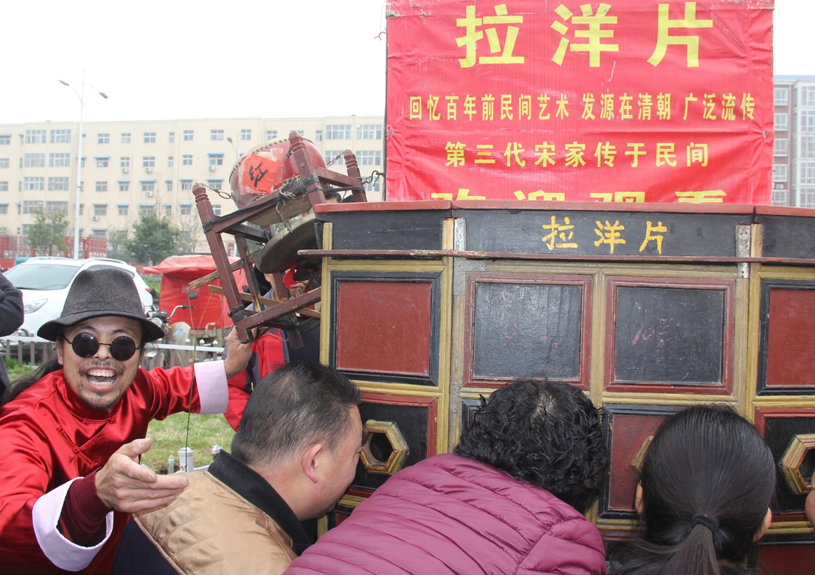 4月5日,在县人民广场,数名市民正围在一起观看非物质文化遗产项目——拉洋片。拉洋片是中国的一种传统民间艺术,也是一项民间文娱活动(也叫拉大片),邢庄乡芦墓张村的拉洋片起源于清朝末年,距今已有一百多年的历史,当代传承人宋长庄。2011年,拉洋片被列入开封市第二批非物质文化遗产保护名录。据悉,当天共有13个市级以上非物质文化遗产参加展示。